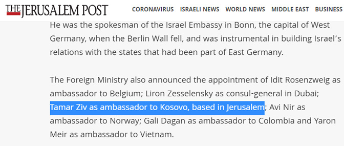 Џерусалем пост јавља да је Тамара Жив именована за амбасадора на тзв. Косову.
