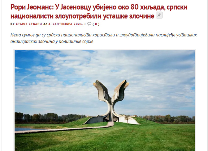 Иначе, текст Рорија Јеоманса већ је био објављен на Balkan Insight 27. августа 2021. и представља једну од реакција на доиста скандалозни текст Џерузалем поста. Међутим, „бранећи нас“ од процене непостојећег аутора Џерузалем поста да је у „Јасеновцу убијено између 2500 и 4500 људи“ и сâм Јеоманс износи ревизионистичку бројку да је у Јасеновцу „између 1941. и 1945. убијено најмање 80.000 српских, јеврејских и ромских мушкараца, жена и дјеце, као и хрватских и бошњачких антифашиста“. Текст је пренет и на Стању ствари под насловом „Рори Јеоманс: У Јасеновцу убијено око 80 хиљада, српски националисти злоупотребили усташке злочине“.
