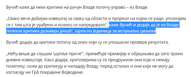 Александар Вучић као председник Владе Србије о „диливери јуниту“ 2015. године (Извор)