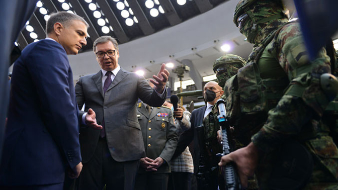 Небојша Стефановић и Александар Вучић на сајму наоружања (Фото: Танјуг)