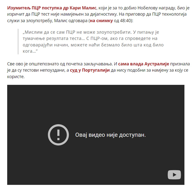 Др Кари Малис, изумитељ ПЦР поступка и добитник Нобелове награде, прије неколико година је изјавио да је „ПЦР процес; он Вам не говори да сте болесни“. Он никад није био намијењен да буде тест за ковид.