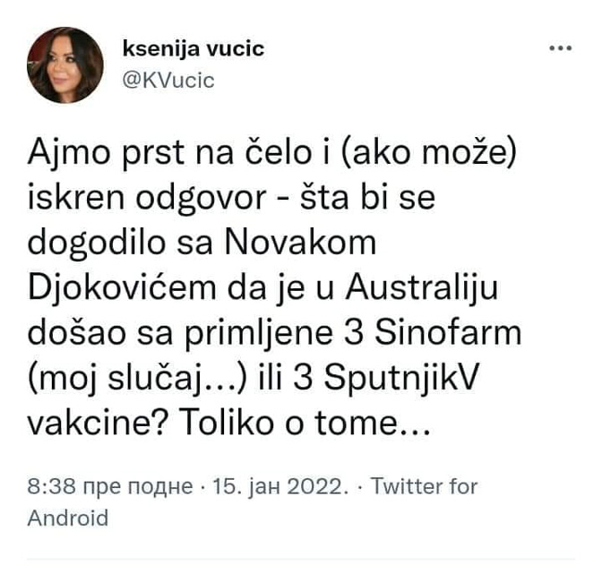 „Вечерас је у Београду, изненада, у 56. години, преминула Ксенија Вучић, мајка нашe двоје деце, Данила и Милице, и моја прва супруга. О месту и датуму сахране накнадно ћемо обавестити фамилију и пријатеље“, стоји у Вучићевој објави.