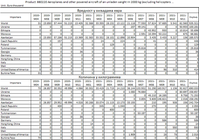 У новембру 2021. извоз дронова из Турске вредео је 62,6 милиона евра а тежио је 92,6 тона. У Украјину је пласирано ових производа за 50,9 милиона евра а у тежини од 80,7 тона док је још вредан спомена био извоз у Етиопију за 10,8 милиона евра тежак 9,8 тона. Било је и симболичних испорука за Мароко и Азербејџан.