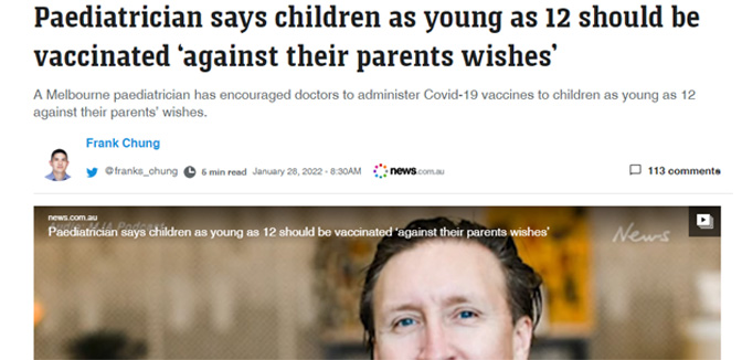 У чланку, од 28. јануара 2022, на сајту www.news.com.au педијатар и професор универзитета у Мелбурну, Џон Маси, охрабрује лекаре да вакцинишу децу старију од 12 година и то без дозволе њихових родитеља. Чланак такође цитира изводе из његових прилога за Medical Journal of Australia (MJA).