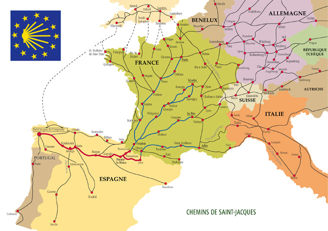 Западно хришћанство зна за три главна ходочасничка пута, овим редосљедом: Рим, Јерусалим и Сантјаго де Компостела. Да би се на крају ходочашћа до гроба апостола Јакова у Сантјагу де Компостели (који се на мапи Шпаније налази у горњем лијевом углу), добила љуштура шкољке Сан Жак (Јаковљева лепеза) као доказ да је човјек доходочастио у средњовјековно вријеме оно, било је потребно пјешачити седмицама или чак мјесецима, из разних праваца, Француским путем (преко Пиринеја), Сребрном рутом (из Севиље) или Португалском рутом.