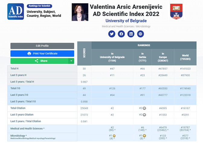Цитираност проф. Валентине Арсић Арсенијевић (Извор)