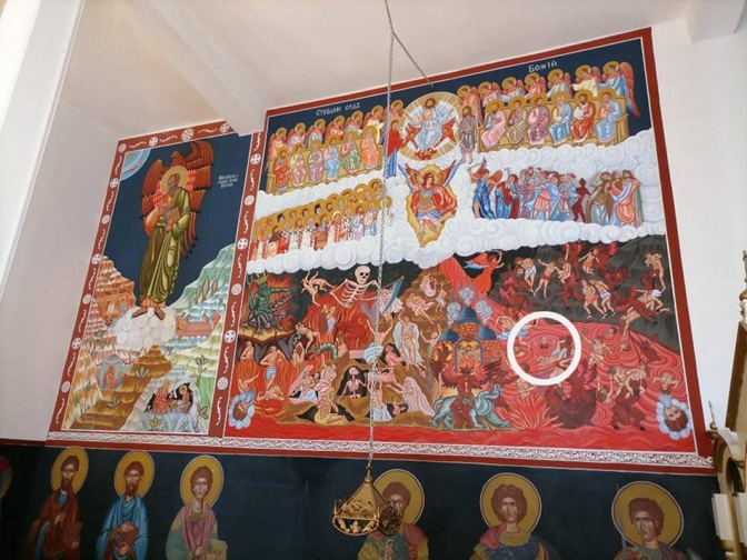 “Govorio bi vam o jednom tužnom događaju koji se dogodio u skorije vrijeme u Beloj crkvi, gdje su freske koje je oslikao jedan Užičanin Zoran Selaković. Na jednom je mjestu oslikao i fresku Strašnog suda, fresku s vječnim mukama. Tu se pomalja veliki zločinac i heretik Alojzije Stepinac. Znamo tko su bili nadahnitelji tih zločina ustaških za koje su dobili pohvale iz pakla i Rima. Kakva vjera, takvi i mučenici. Ali, avaj, netko je to vidio i netko je to snimio. Čuli su Hrvati u Hrvatskoj, pa brže bolje to napisali u svojim medijima. Reagira se iz Hrvatske i Katoličke crkve. I nećete vjerovati, naređuje se slikaru da se freska prekreči” – rekao je među ostalim episkop Ksenofont, koji se u govoru okomio i na one u pravoslavnoj crkvi koji su naredili uklanjanje freske.