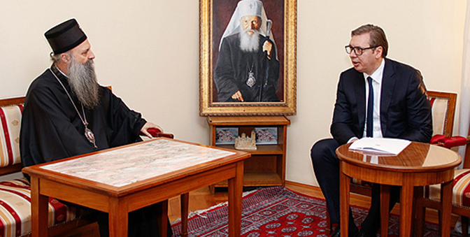 Његова Светост Патријарх српски г. Порфирије примио је 25. фебруара 2022. године у Патријаршијском двору у Београду г. Александра Вучића, председника Републике Србије.