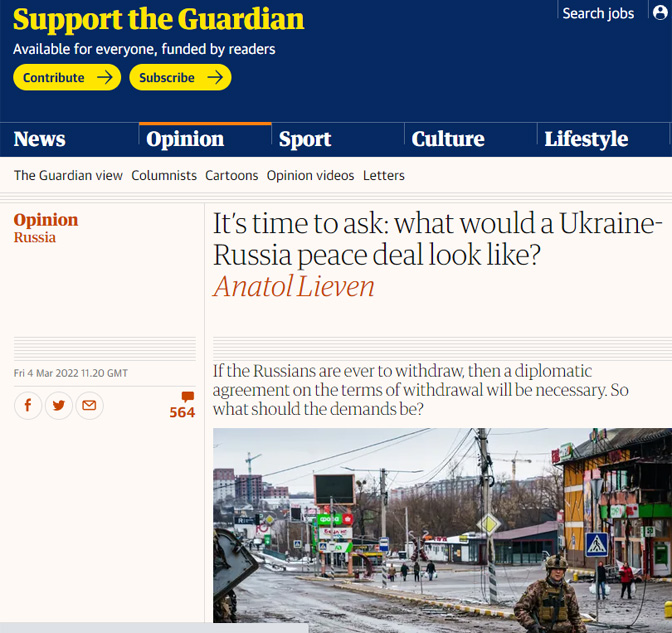 - It’s time to ask: what would a Ukraine-Russia peace deal look like? (Anatol Lieven, Guardian, Fri 4 Mar 2022)