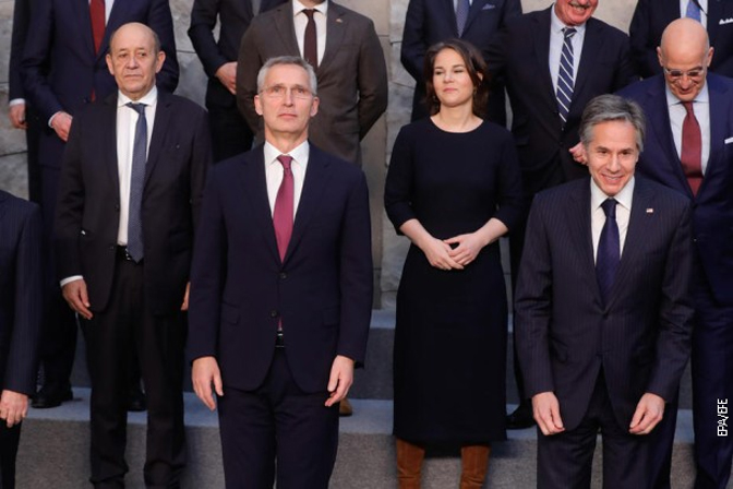 Француски министар спољних послова Жан-Ив Ле Дријан, генерални секретар НАТО-а Јенс Столтенберг, немачка министарка спољних послова Аналена Бербок и амерички државни секретар Ентони Блинкен на састанку у седишту НАТО-а у Бриселу, 4. марта 2022. (Извор: РТС)