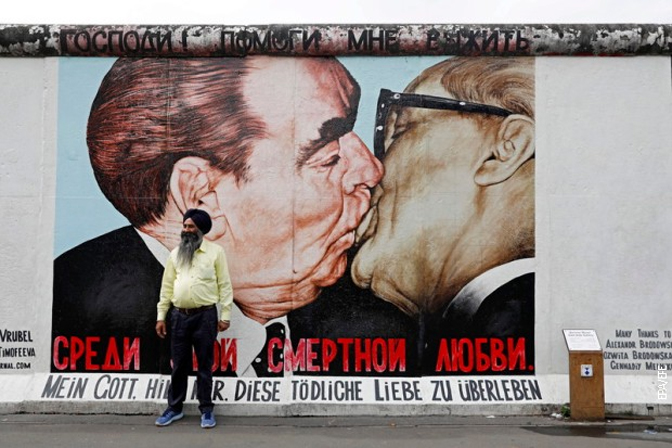 Леонид Брежњев и Ерих Хонекер на муралу Дмитрија Врубеља са Берлинског зида „Боже! Помози ми да преживим ову смртоносну љубав“ (Извор: РТС)