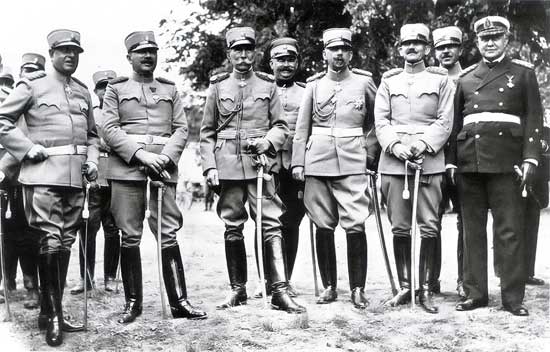 Генерали и адмирали Краљевине Југославије. Слева на десно: Милан Недић, Милош Јовановић, Петар Бојовић, Љубомир Максимовић, Ђура Докић, Емило Белић, Миливоје Димитријевић и Виктор Викерхаузер, 8. септембра 1930. године (Википедија)