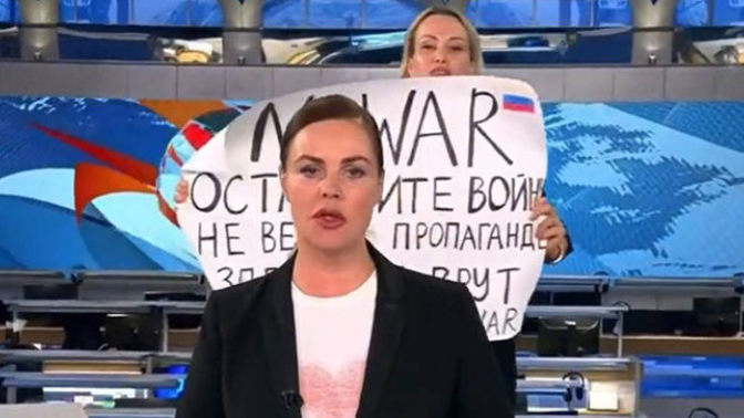 Марина Овсјаникова ушла у студио Првог канала руске државне телевизије, за време информативног програма уживо, са транспарентом на којем је писало „Не рат” и „Руси против рата”