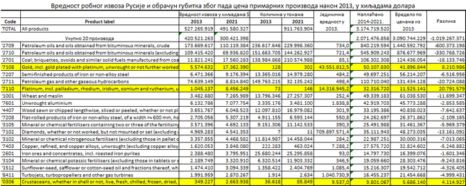 Укупна вредност робног извоза 2014-2021 износила је 3.174,7 милијарди долара. Извоз 20 производа вредео је 2.071,5 милијарди долара. Да су се задржале цене из 2013. он би вредео 3.090,7 милијарди долара или 1.019 милијарди више него што је наплаћено! Укупна вредност извоза била би најмање 4.194 милијарди долара, не рачунајући извозне губитке код других производа. Код природног гаса, уместо обрачунатих 20,7 милијарди губитак је сигурно око 300-350 милијарди долара што додатно повећава укупан губитак и изгубљене извозне приходе.