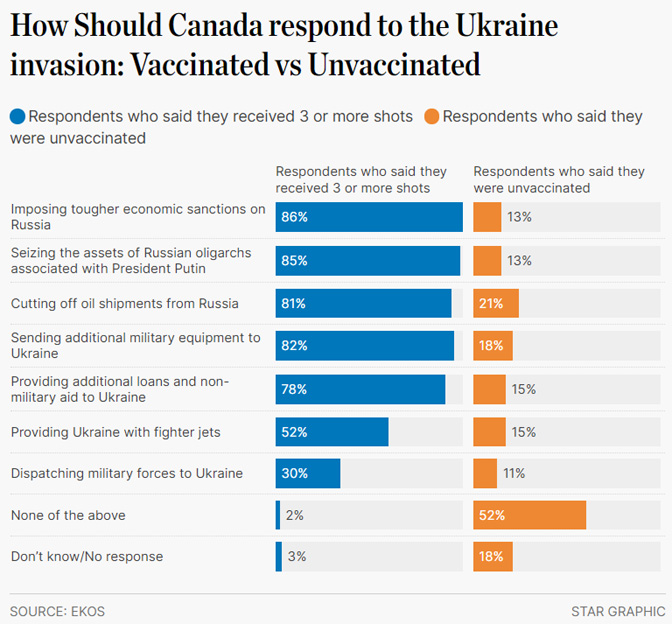 Према налазима нове анкете из Канаде, вакцинисани су знатно склонији ризиковању Трећег свјетског рата поводом Украјине, подржавајући агресивне поступке против Русије, док су невакцинисани склонији дипломатском рјешењу.