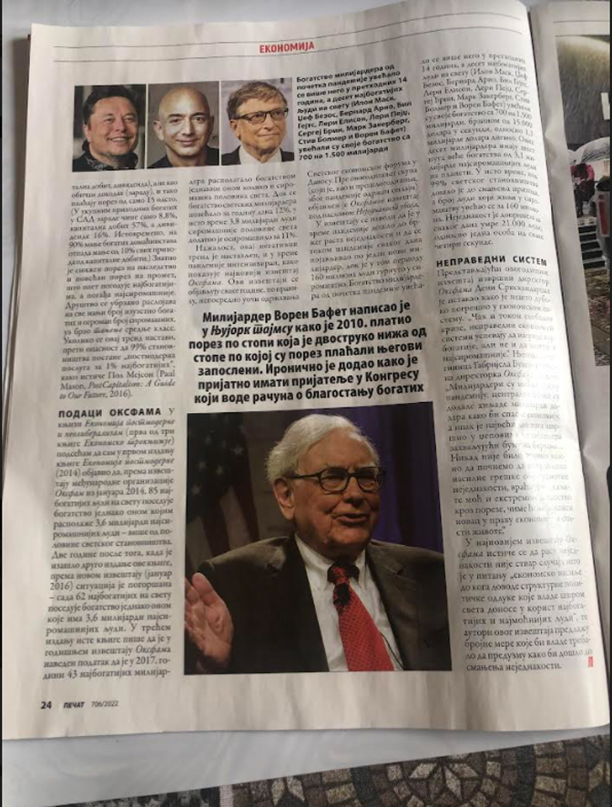 Мада сам из издања у издање (2014, 2016, 2019) наведене књиге констатовао да се негативни тренд наставља, најновији извештај Оксфам-а показује да је у последње време дошло до невероватног раста неједнакости, па се богатство милијардера од почетка пандемије увећало више него у претходних 14 година,, а богатство десет најбогатијих људи на свету се више него удвостручило.
