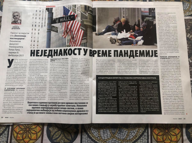 Пишући о неолиберализму као идеологији постмодерне нагласио сам да се он реализује у интересу богатих и моћних, који имају огромну финансијску (и не само финансијску) моћ помоћу које обликују политички, медијски и (квази)научни простор како би се водила економска политика и јавно промовисале вредности које њима одговарају. Због тога последњих година углавном слушамо да је проблем настао јер људи не живе у складу са реалним могућностима и да се мора ићи на даље стезање каиша и рационализацију радних места (преведено са орвеловског новоговора: даља отпуштања запослених). Много мање се говори о проблему неједнакости, тј. неравномерне и неправедне расподеле и концентрације богатства, те да ту треба тражити решење.