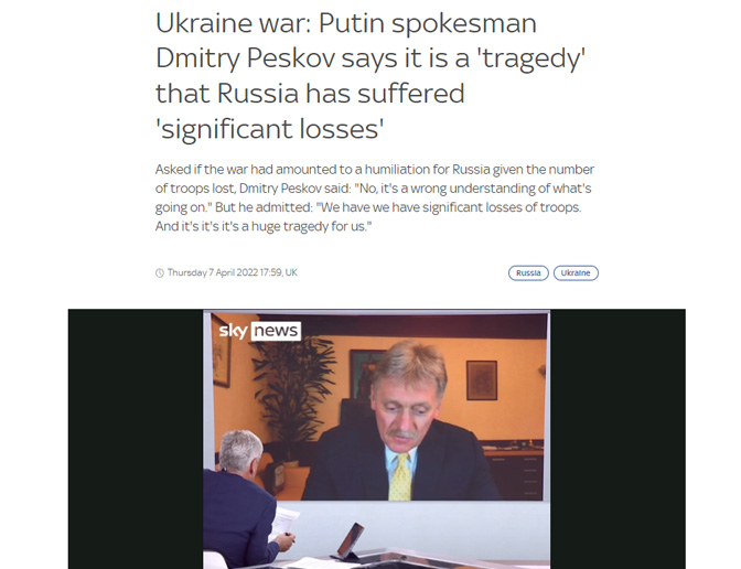 ‘Упитан да ли рат представља понижење за Русију с обзиром на број изгубљених војника, Дмитриј Песков је рекао: „Не, то је погрешно схватање онога што се дешава“. Али он је признао: „Имамо значајне губитке у трупама. И то је огромна трагедија за нас“.’