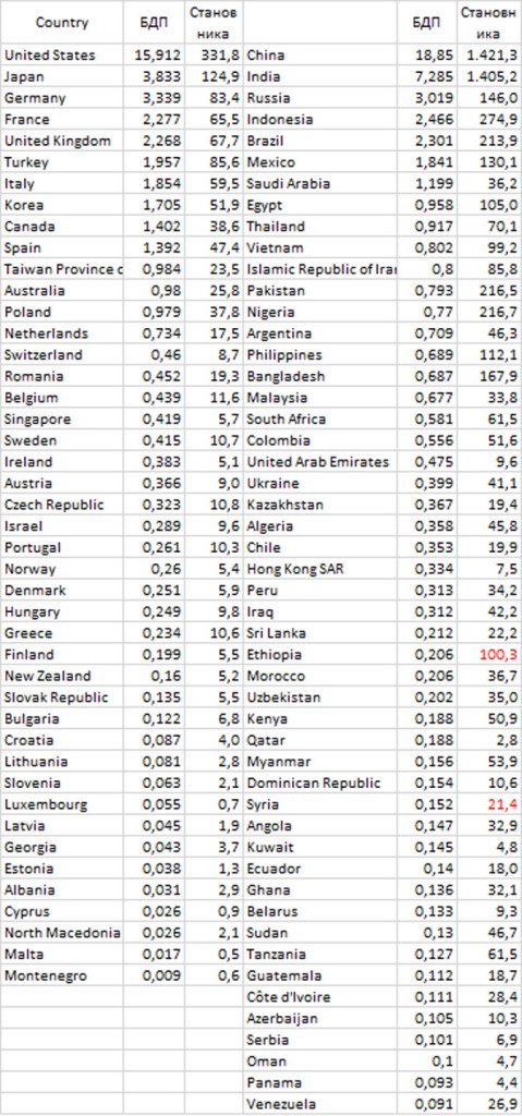 Табела приказује удео у светском БДП-у и број становника у милионима у 2022. развијених земаља и чланица НАТО и 50 земаља са највећим уделом у светском БДП-у међу 152 чланице ММФ-а које нису у првој групи.