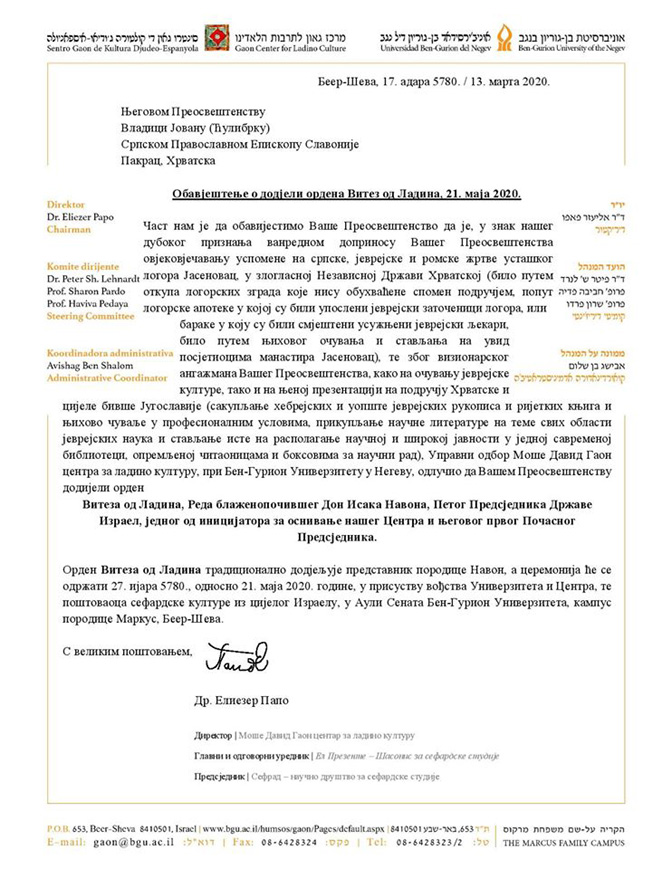 Један део награде се односи на то чување сећања, поготово на јеврејско страдање у Другом светском рату. Други део награде је због очувања културе шпанских Јевреја, сефардске културе које ми чувамо у нашој библиотеци у Пакрацу, каже владика славонски