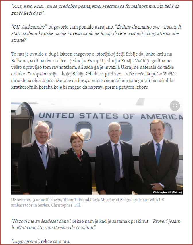 Подсетимо, сенатор демократа Крис Марфи у изјави за Глас Америке је, мимо дипломатског бонтона и правила, открио детаље разговора са првим човеком Србије. При том је, ако је превод његовог наступа био веродостојан, пренео да му је Вучић казао „позови ме за 60 дана. Провери јесам ли учинио оно што сам рекао да ћу учинити“.