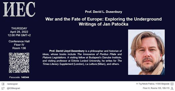 У четвртак 28. априла 2022. године у свечаној сали Института за европске студије у Београду одржано је предавање Дејвида Лојда Дисенберија под називом „Рат и судбина Европе: истражујући подземне списе Јана Паточке“. Проф. др Дејвид Лојд Дисенбери је филозоф и историчар идеја, чије књиге укључују Невиност Понтија Пилата и Платонска законодавства. Гостујући је сарадник на Дунавском институту у Будимпешти и гостујући је професор на Универзитету Етвеш Лоранд, а пише и за Књижевни додатак листа Тајмс (Лондон), Ла летура (Милано) и друге листове. Јан Паточка, чији списи су били предмет предавања, био је чешки филозоф (1907-1977), један од последњих ученика Мартина Хајдегера и Едмунда Хусерла. Поред тога што је био један од настављача егзистенцијалистичке феноменологије, Паточка је био и комунистички дисидент који се никада није мирио са комунистичким режимом у тадашњој Чехословачкој успостављеним под патронатом СССР-а.