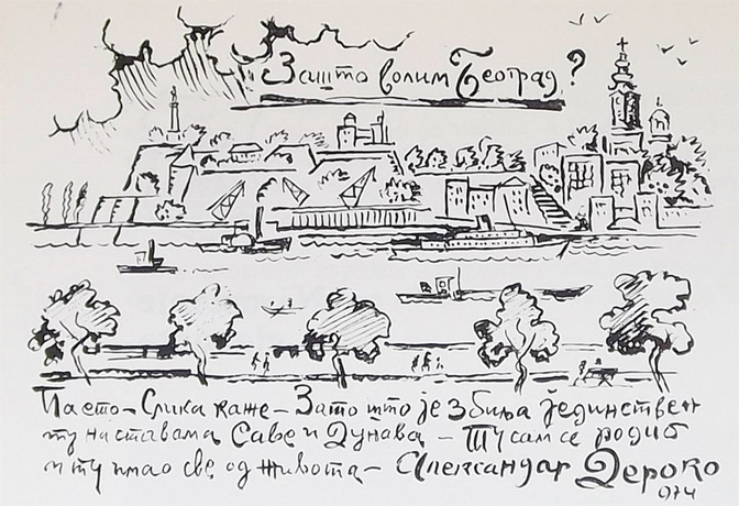 Споменик Александру Дероку подигнут је у Београду, на углу Чубрине улице и Топличиног венца, не само на основу чињенице да је овим просторима свакодневно пролазио већ и због његове љубави према престоници и њеној историји. То га је покренуло на потрагу за изгубљеном чудотворном иконом Богородице Београдске те се раних педесетих година прошлог столећа обрео у Истанбулу, истражујући Београдску цркву у којој су првобитно биле похрањене реликвије из Саборне цркве Београдске митрополије на Калемегдану. Дероко је снимио неке друге затечене иконе и мобилијар цркве а следећом приликом уверио се да је и то нестало у пожару који се збио између његове две посете. Икона Богородице Београдске никада није пронађена али овај епитет понеле су две „итало-критске“ иконе из XVI столећа – једна Одигитрија из проскинитара у цркви Светог Марка и друга – Богородица Страсна из мале цркве Светог Саве на Врачару.