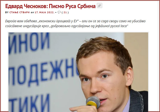 Још један жутокљуни руски стручњак опште праксе за балканске послове из класе прослављених правосудова и бондарѣва, које млађахни Чесноков ипак надмашује плиткошћу расуђивања. Пошто случајно за собом имам доста година конкретног рада на српско-руским културним везама (много више нѣго што дотичном траје укупна каријера и мало више од половине његовог живота), могао бих написати још дрчније и безобразније „Писмо Србина Русима“ као утук, само кад таква писма већ сама по себѣ нѣ би прѣдстављала поприличну будалаштину. Зато само пар напомена за виспреног новинара и оне који оваква писанија озбиљно схватају.