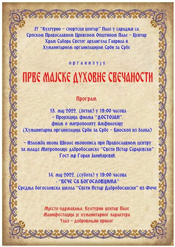 „Прве мајске духовне свечаности“, одржане 13. и 14. маја о..г. у Културно-спортском центру Пале уз благослов Митрополита дабробосанског Хризостома, израз су потребе тамошњих житеља за садржајима у којима се открива идентитет њиховог културног и хришћанског бића. Без великих амбиција на почетку, циљало се на трајање у наредним годинама. Управо спонтаност кроз синергију културних и црквених делатника произвела садржаје и догађања, најављене насловом манифестације. Чини се да је на овим просторима у најбољој мери изражено јединство српског народа, пре свега на основу отворености, простодушности и на тај начин оријентисане свести житеља Републике Српске. Првог дана одржана је филмска пројекција и отворена изложба икона а дугог је уприличено „Вече са богословцима“ тј. ученицима Богословије „Свети Петар Дабробосански“. Један од најдивнијих изданака агиолошке лозе православља, Свештеномученик Сарајевски и Јасеновачки Петар Дабробосански (Зимоњић), на тај начин, указује се као наша луча, звезда водиља али и огледало. Чињеница да „Прве мајске духовне свечаности“ једноставно рефлектују профил културних и образовних садржаја те њихову перманентност, најпре доприноси објективитету и јасноћи уоченог одраза данашње стварности на наведеном подручју.