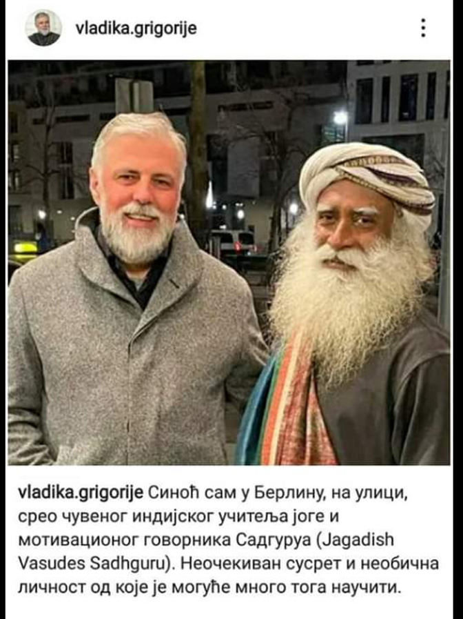 Минкен, Немачка, 15. 6. 2022. (С*ање ствари) – Говорећи за Удружене медије Друге Србије, владика минкенски и целе Немачке бискуп Григорије се још једном присетио свог незаборавног сусрета са гуруом Садгуруом (Jagadish Vasudev Sadhguru): „Тек кад сам видео тог великог индијског учитеља јоге и мотивационог говорника схватио сам шта је православље и правоживље! Иако је сусрет био случајан и кратак, Садгуру ми је открио све тајне православне вере!“