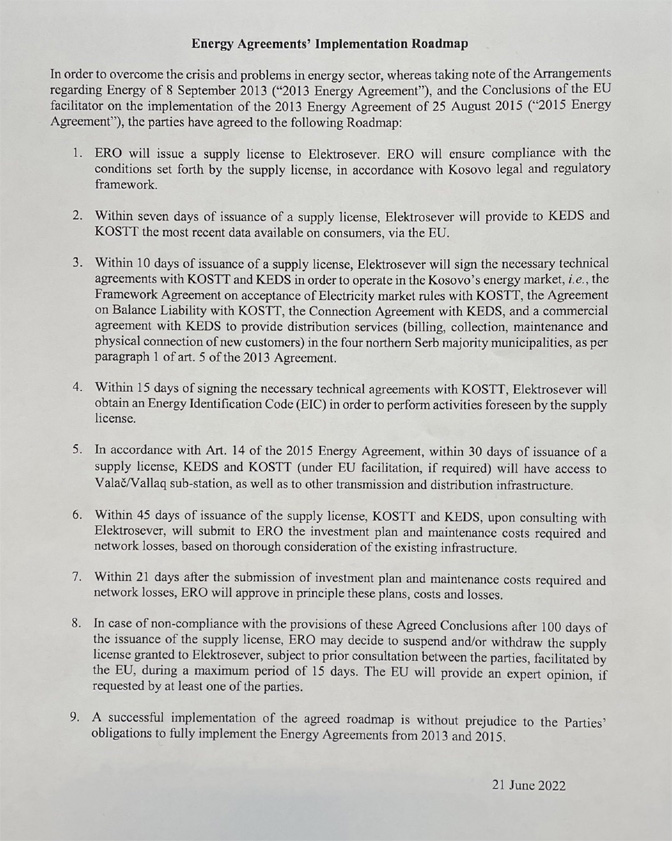 Како је наведено, да би се превазишла криза и проблеми у енергетском сектору, узимајући у обзир споразум о енергетици од 8. септембра 2013. и закључке посредништва ЕУ о примени тог споразума од 25. августа 2015, стране су се договориле о следећој мапи пута: