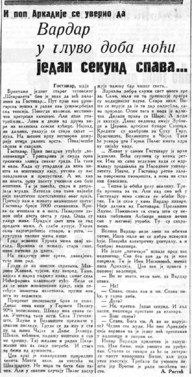 „Касно лето је прошло и наступили су ведри јесењи дани. За три-четири дана 1961. године дошао сам, са супругом и децом, у посету мојим старим родитељима у селу Врутоку на извору Вардара (ближа околина Гостивара).