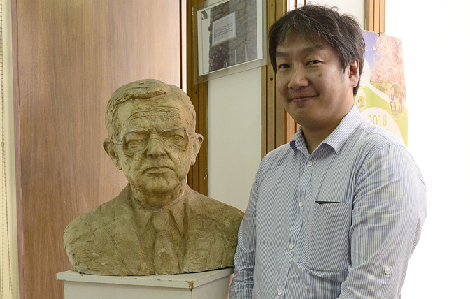 Јапански слависта Мотоки Номачи, који је пронашао изгубљену македонску граматику коју је написао совјетски професор Самуил Бернштајн, са бистом Блажа Конеског, једног од кодификатора савременог македонског књижевног језика (Фото: М. Златевска)