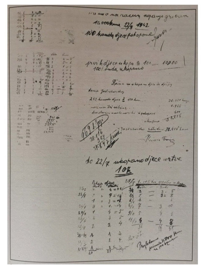 На првој страници дневника записано је да је 22. јула 1942. сахрањено 107 дјеце. Онда стоји рачун и потврда: „Примио на рачун копања гробова 10.000 куна за 100 комада дјеце покопане“.