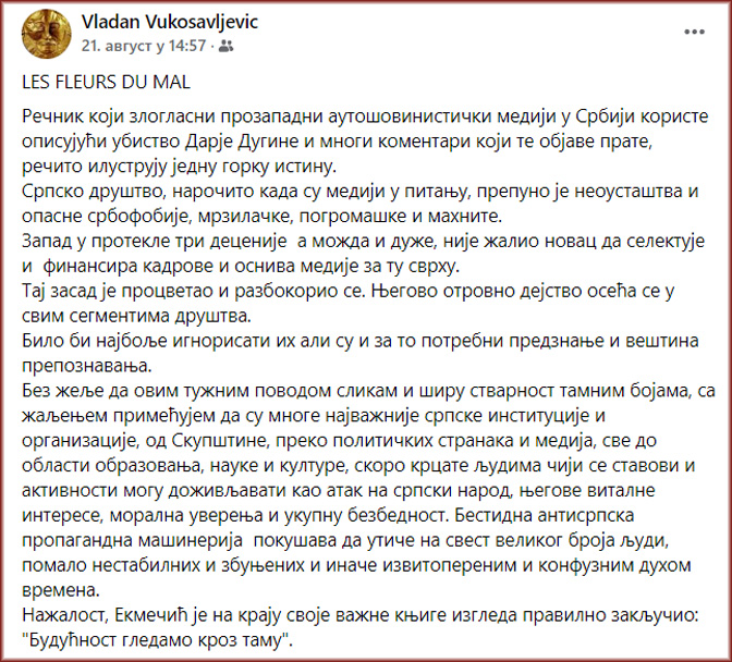 Наш добар пријатељ и друг у идеолошкој борби, Дарија Дугина–Платонова, постала је жртва терористичког акта у Русији услед кога је погинула. Њен аутомобил је експлодирао убрзо након одласка познатог новинара и конзервативног активисте.
