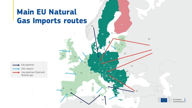 Главне трасе увоза природног плина у ЕУ (црвеном означене трасе плина из Русије) (Извор: Твитер налог Европске комисије)