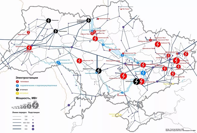 Електросистем Украјине (црвено – термоелектране, плаво – хидроелектране, црно – атомске електране, жуто – ветроелектране) (Извор: Украјина.ру)