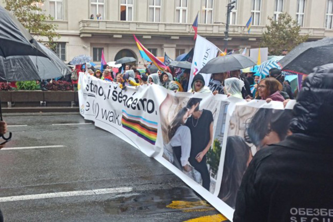 Окупљени носе и бројне заставе и кишобране у ЛГБТ бојама, док транспаренти углавном нису раширени због кише, преноси Политика.