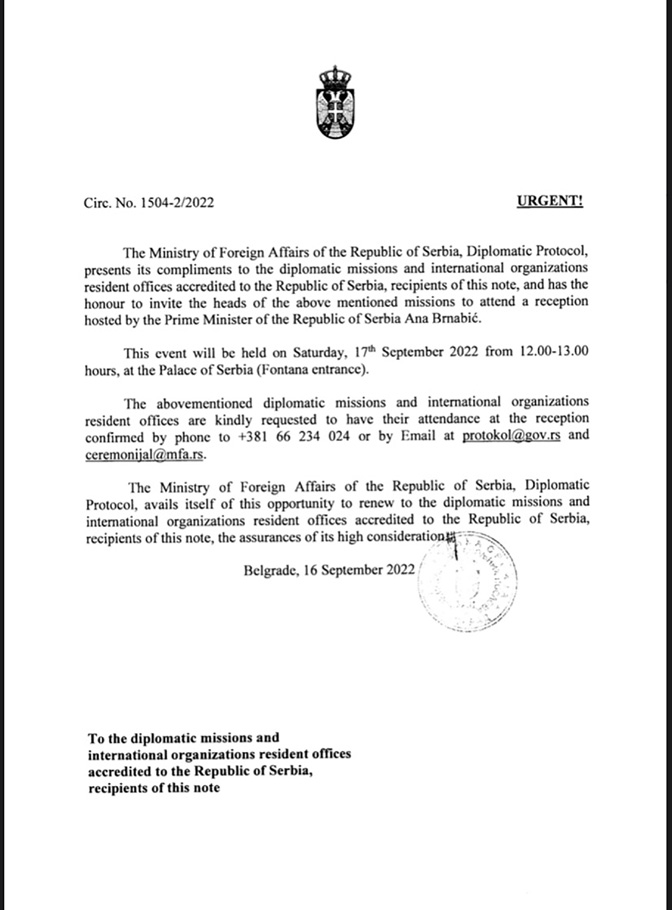 Оно што јесте изазвало чуђење међу дипломатском заједницом је што у позиву на пријем није наведено поводом чега се овај пријем организује.