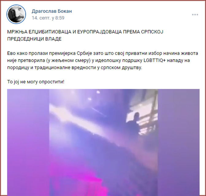 У једном тренутку Бокан своју ботовску страст према Вучићу егзалтирано преноси на Ану Брнабић, па слави њен наводни отпор ЛГБТ агенди, наводећи да је активисти Европрајда вређају зато што је одбила да свој „одабир начина живота“ наметне у јавном простору за потребе нарушавања традиционалних вредности српског друштва. Овде се Бокан нашао у двоструком шах-мату. Наиме, пошто је Његова Светост Патријарх српски Господин Порфирије свом снагом подржао литије и позвао народ да настави са окупљањима и литијама, то значи да се он по Бокановој аналитичкој поставци налази у неприродном савезу са ЛГБТ агендом и да води хибридни рат против Србије. Други шах-мат је још тежи: Ана Брнабић не само да је свој одабир начина живота употребила као мотив за наметање ЛГБТ идеологије српском друштву, већ је и дословно поништила одлуке МУП-а и Управног суда, изводећи својеврсни државни удар и то по захтеву никог другог до америчког амбасадора Кристофера Хила. Показало се да хибридни рат против Србије, њеног Устава и њене државности заиста постоји, али да тај рат заправо воде Ана Брнабић, Александар Вучић и Драгослав Бокан.