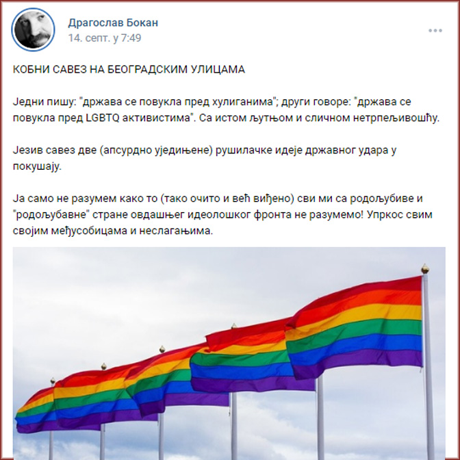 Једну од најпрљавијих улога у игроказу око одржавања Европрајд параде несумњиво је одиграо Драгослав Бокан. Његов наратив је био овакав: ЛГБТ активисти и литије за одбрану брака и породице у политички неприродном савезу воде хибридни рат против државе Србије и спремају државни удар на улицама Београда. Дакле, по Бокану, Европрајд и литије, иако идеолошки и вредносно супротстављени, ипак имају један заједнички именитељ: антидржавно деловање на престоничким улицама.