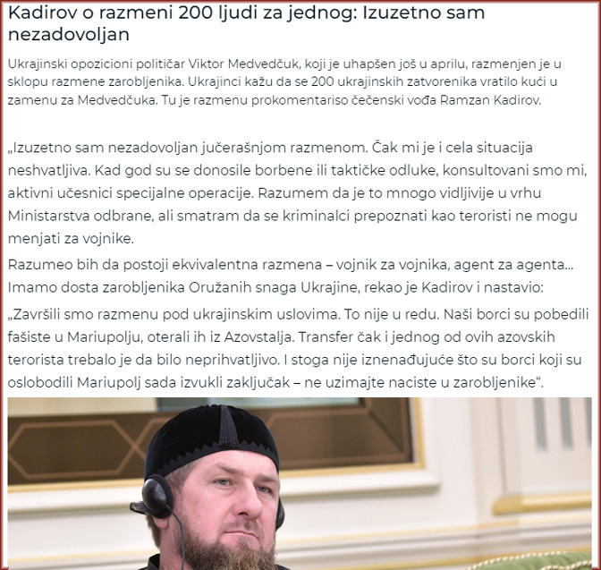 Изузетно лош,неаргументован и навијачки текст господина Спасојевића, чији је једини циљ да сачува ауру непогрешивости и велике државничке мудрости господина Путина. На жалост, све говори да је реч о веома непромишљеном и потенцијално, по руске интересе веома штетном потезу председника Русије. Пустити на слободу зликовце, командате и официре нацистичког пука „Азов“ и енглеске плаћенике на слободу, људе који су осуђени или требало да буду осуђени на стрељање због почињених зверстава, да би био ослобођен Виктор Медвешчук је, пре свега морално, катастрофа. Да подсетим, Медвешчук важи за једног од најбогатијих људи Украјине и човека близког Путину. Да ли су то „заслуге“ довољне да се због њега пусте на слободу најгори злочинци и непријатељи руског народа? Како ће то утицати на морал Руса који су на фронту, оних које сада мобилишу и њихове породице? Образложење да је Медвешчук веома важан за интересе Русије, јер је планиран за будућег, проруског, председника Украјине, вређа здрави разум. Део Украјине где живе Руси и проруски оријентисани Украјинци (а њих ће бити све мање после овог крвопролића) ће, формално, или неформално, бити део Русије, а остатак Украјине толико антируски да било ко, ко примирише на било шта руско нема никакве шансе да буде било шта у таквој земљи. Лично сам веома забринут развлачењем овог рата (или специјалне операције, како коме одговара) а апсолутно разочаран овом разменом заробљеника. Али све то ми не даје за право да као господин, потписан са „морава“, извлачим НАТО-вски закључак да је ово што се сада дешава резултат “ фрустрације оцвалих кагебеоваца распадом Варшавског уговора и СССРа“ и њихове жеље да под старе дане обнове СССР. Да подсетим, Русија је без речи противљења и без зрна барута пустила да се сви који то желе отцепе и направе своје државе. И још важније, да са собом одведу милионе Руса, који су прихватањем вештачких,бољшевичких граница, остали ван матичне државе. Али Русија ни тада, ни било када није пристала на то да се у њиховом комшилуку праве непријатељске државе, да се у њима Руси обесправљују и понижавају и да се од тих држава праве полигони за угрожавање саме Русије. Није Русија по околним земљама правила њихова „Косова“. Правили су их исти они који су направили наше „Косово“. Пуних 8 година је Русија молила да се испоштују и спроведу „Мински споразуми“ које је поред ње и Украјине потписао и гарантовао и тај Запад и којима Донбас (ДНР и ЛНР) остају у Украјини, а тек сада чујемо од Украјинаца да они то и нису потписали да би се решила ситуација и осигурао мир, већ да купе време да се обуче и наоружају за рат. Да не подсећам на то како је Русија пред овај рат у Украјини практично молила Запад да се направи договор који ће свима гарантовати безбедност и како је дрско и понижћавајуће одбијена. Шта је требало да ураде? Да ћуте и дозволе егзодудус Руса из Донбаса и гледају поново како им спаљују живе сународнике као у Одеси? А затим да исто доживе на Криму? И на крају да аплаудирају кад Украјину приме у НАТО и кад им разместе НАТО ракете на 5 минута од Москве?