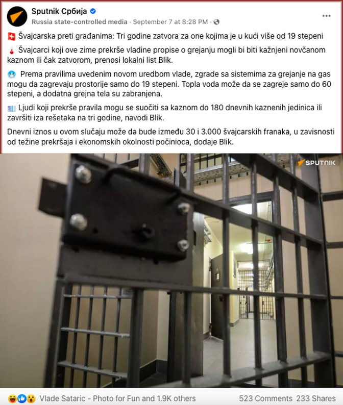 Пријатељица из Швајцарске, универзитетски професор, прича ми на српском, с плажним пешкиром преко рамена, како је немогуће да било ко установи да ли ће она током зиме што слиједи загријати стан изнад прописаних 19 степени и изложити се казни! Гледам је као особу инфицирану Европом. Ако су нам свима који памтимо, кажем, пуцали у главу да би нам бесконтактно измјерили температуру на улазу у дом здравља, општину или банку, то значи да ће неким пак уређајем за само 100 евра скупљим моћи да ласерски измјере и температуру свачијег стана без куцања на врата.