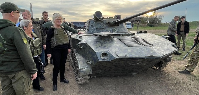 Министарка одбране Немачке Кристина Ламбрехт приликом посете Одеси позира поред заробљеног руског тенка (Фото: Јерг Бланк/ДПА)