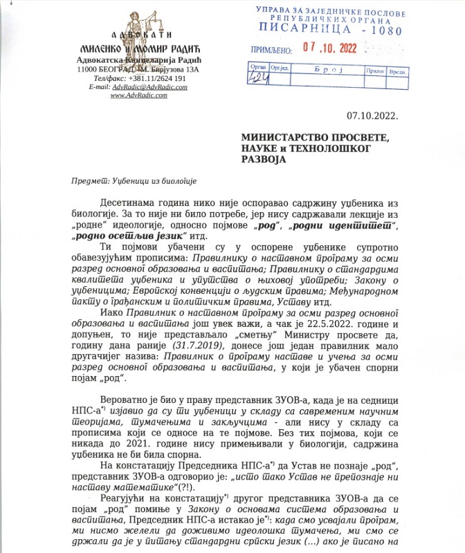 Допис Адвокатске канцеларије Радић Министарству просвете од 7. октобра 2022. (1) (Извор: Адвокатска канцеларија Радић)