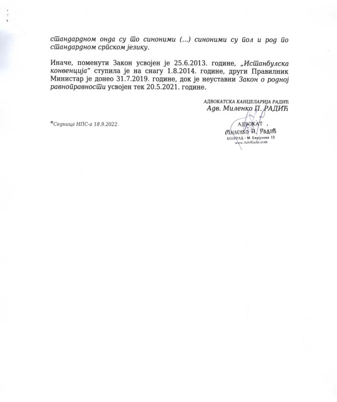 Иначе, поменути Закон усвојен је 25. 6. 2013. године, „Истанбулска конвенција“ ступила је на снагу 1. 8. 2014. године, други Правилник Министар је донео 31. 7. 2019. године, док је неуставни Закон о родној равноправности усвојен тек 20. 5. 2021. године.