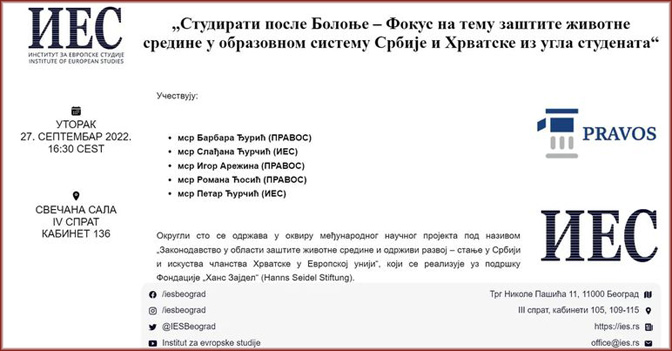 Институт за европске студије (ИЕС) из Београда, заједно у сарадњи са Правним факултетом Универзитета „Јосип Јурај Штросмајер“ (Josip Juraj Strossmayer) у Осијеку (ПРАВОС), организивао је округли сто „Студирати после Болоње – фокус на тему заштите животне средине у образовном систему Србије и Хрватске из угла студената“. Округли сто је био одржан 27. септембра 2022. године, а учествовали су докторанти мср Игор Арежина (ПРАВОС), мср Барбара Ђурић (ПРАВОС), мср Романа Ћосић (ПРАВОС), мср Слађана Ћурчић (ИЕС) и мср Петар Ћурчић (ИЕС).
