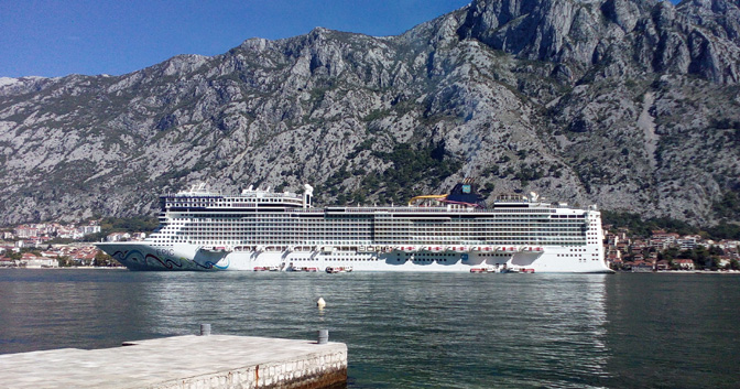Највећи крузер који је икад упловио у Боку Которску, „Norwegian Epic“, чека своје октобарске путнике да обиђу Котор. Они су се на највећи крузер који је икад упловио у Боку Которску вратити као и сви туристи: нити су видјели што им се показивало, нити су чули што им се говорило (Фото: Н. М.)