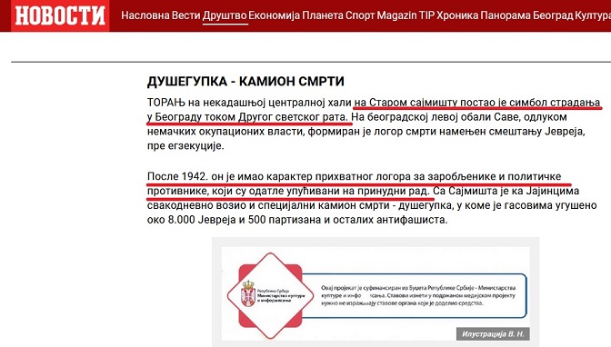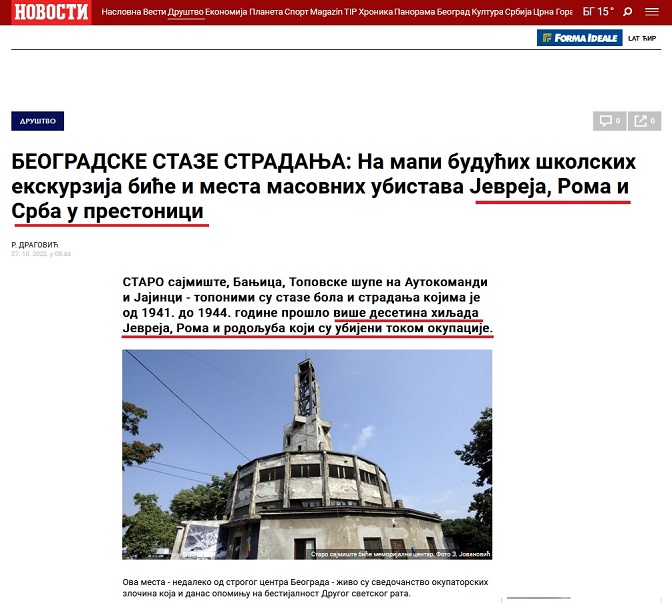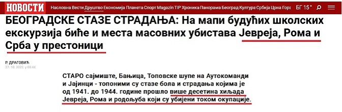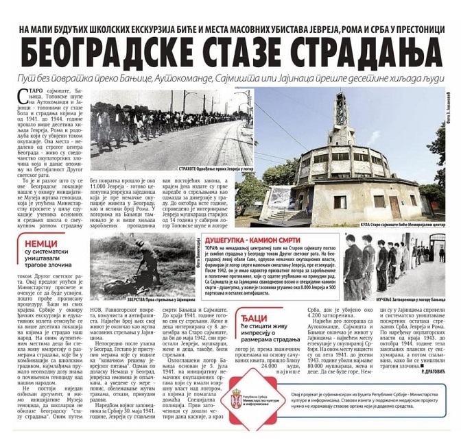 У дневном издању новина као и на порталу компаније Новости, 27. октобра ове године, објављен је прилог под насловом „БЕОГРАДСКЕ СТАЗЕ СТРАДАЊА: На мапи будућих школских екскурзија биће и места масовних убистава Јевреја, Рома и Срба у престоници“ аутора Р. Драговића.