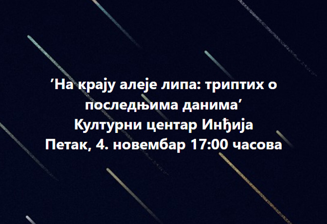 „На крају алеје липа: триптих о последњим данима“ говори о судбинама троје српских сликара страдалих у репресалијама над становништвом окупираног Срема у Првом и Другом светском рату – Данице Јовановић, Саве Шумановића и Рафаила Момчиловића. Уметници различитих сензибилитета одрастали су у другачијим епохама, срединама и друштвено-економским условима и нестали у неједнаким животним добима.